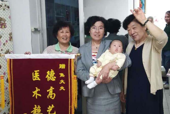 焦雪英院长讲述治疗过程:患者结婚七八年不孕,四处求医未见效果,都已经放弃治疗了,我和她舅妈认识,后来她舅妈把她硬拉过来我这里就诊。做完详细检查后,确诊为原发不孕,多囊暖巢综合征,输卵管阻塞。经中西结合治理,理疗,行输卵管通液术,保守治疗,采用物理疗法。其老公弱精症,在我院采用中西结合治疗,双方坚持治疗半年后怀孕,现宝宝已出生100天,特送来锦旗感谢我们天伦医院。