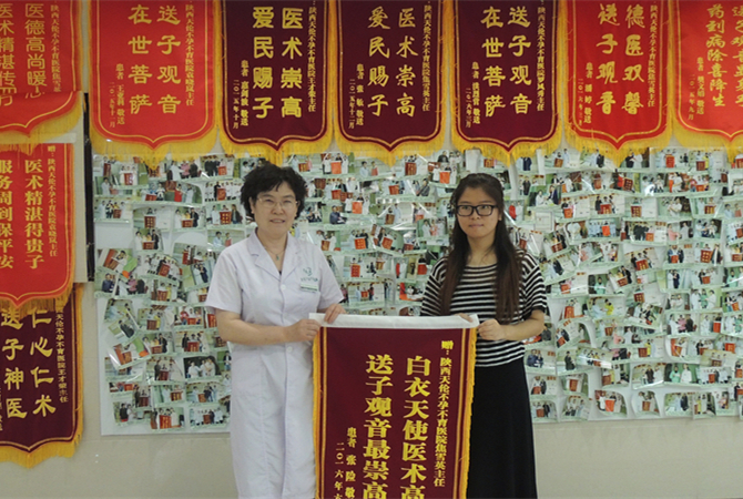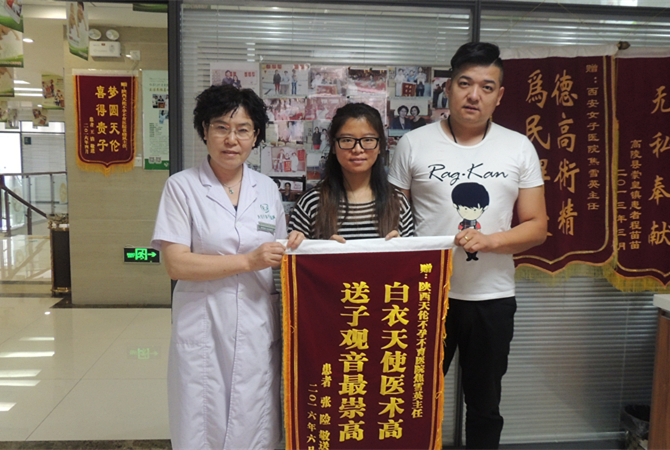 2016年8月27日张险在老公的陪同下来我院报喜,送锦旗感谢焦院长精湛的医术,并给大家发喜糖,分享她的幸福。
