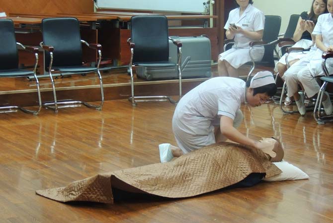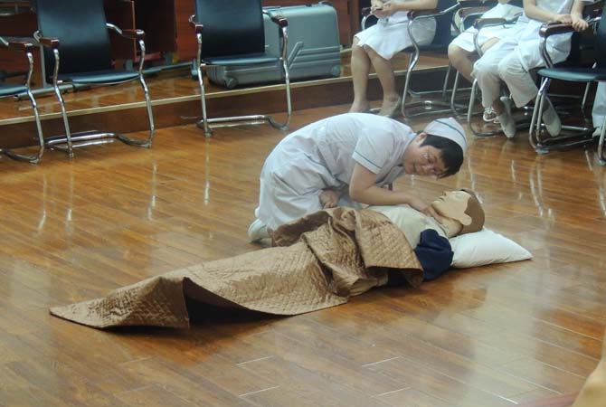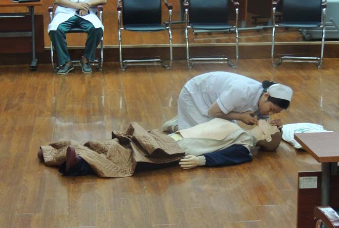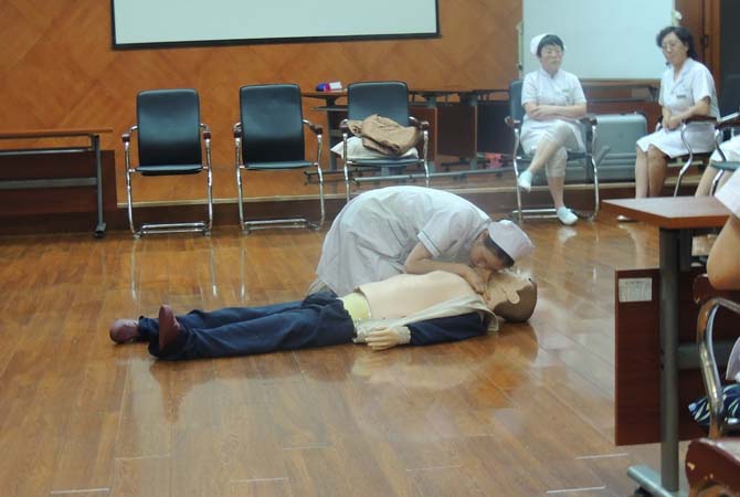 “发现有人倒地,迅速评估环境,意识丧失,无脉搏无呼吸,马上施行抢救”,护士长熟练地在“模拟人”面前实施标准的胸外心脏按压、清除呼吸道异物、施行人工呼吸等5个循环的CPR等步骤。