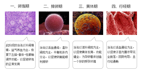 诊疗理论:针对不同的不孕病因,在月经来潮后、经间期、经前期、行经期不同阶段,调理气血、补益充气、调节内分泌,联合西医外治,整体修复与重建生殖系统。